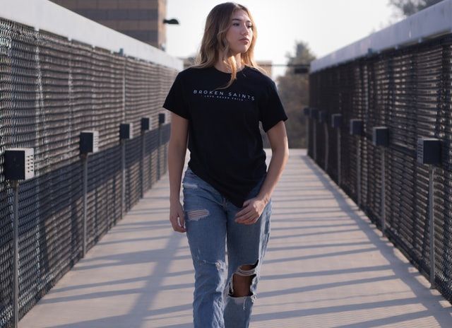 Boyfriendy najczęściej mają talię na „normalnej” wysokości (nad biodrami, ale nie pod samym pępkiem). To tzw. regular waist. Wraz ze wzrostem popularności mom jeans, czyli spodni, których jednym z podstawowych wyróżników jest wysoki stan, również ten trend został przeniesiony do boyfriendów. W efekcie dostaliśmy jeansy które nadal są mają dosyć luźne nogawki, często też sporo „niegrzecznych” przetarć, są luźne na wysokości bioder i w kroku – ale mają podniesioną talię. To spodnie trochę od mamy, a trochę od chłopaka.
